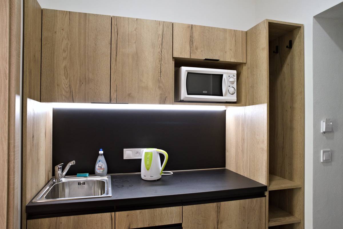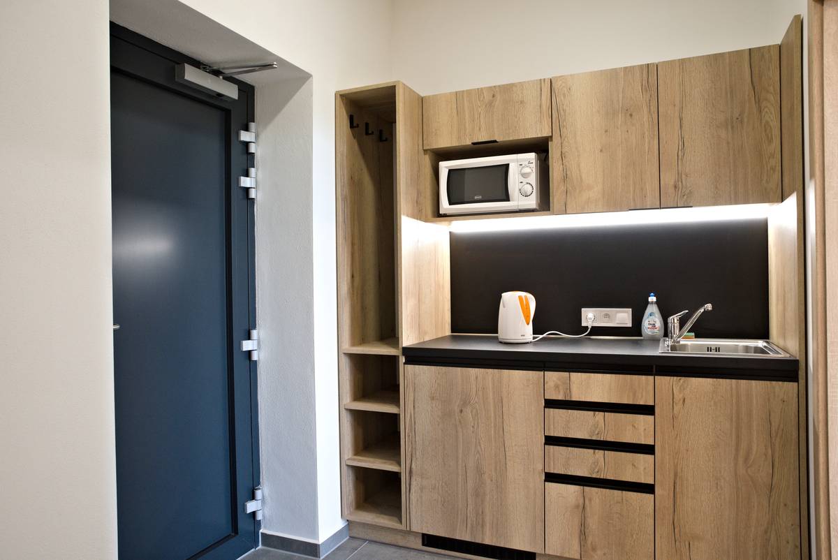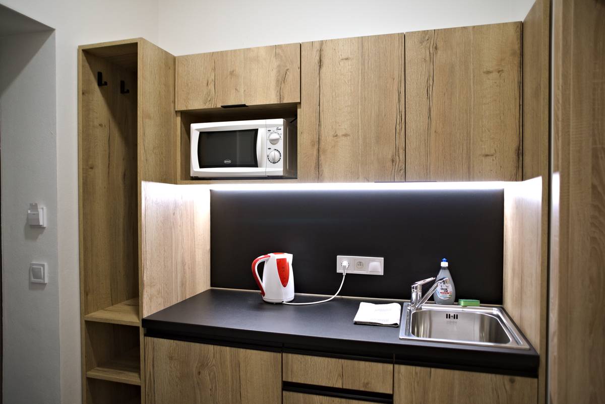 soukromý kuchyňský kout, lednice, rychlovarná konvice, mikrovlnná trouba, příslušenství pro vaření kávy a čaje